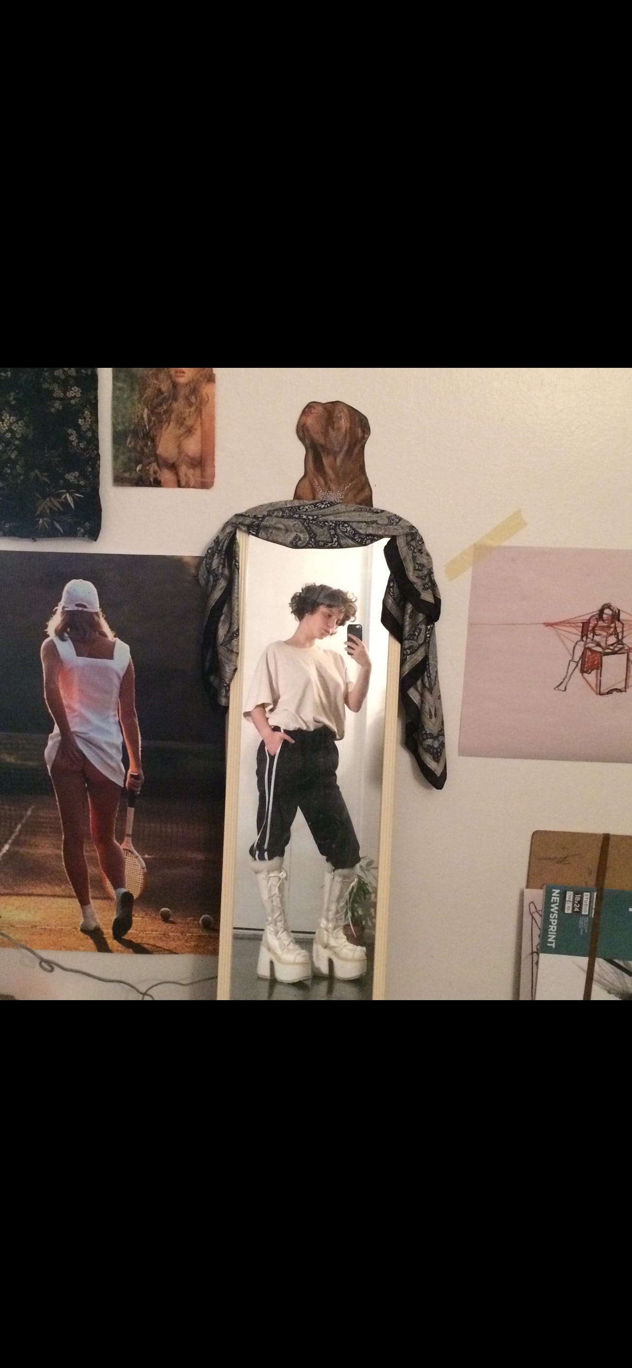 Another thing from 2016 I would love to bring back into my personal rotation but am genuinely terrified of after the past ten years’ brutality on my body, especially my lower half, are platforms—we (my college buds and I) used to call the below my “ten-shot boots” because wearing them was the equivalent of taking ten shots in terms of how they affected my mobility, but also my confidence. I was fucking unstoppable in these thrifted, fur-lined monstrosities, and I would do anything to get to wear them for one more unhinged night. They looked especially good with sporty togs like tucked-in track pants, IMO.