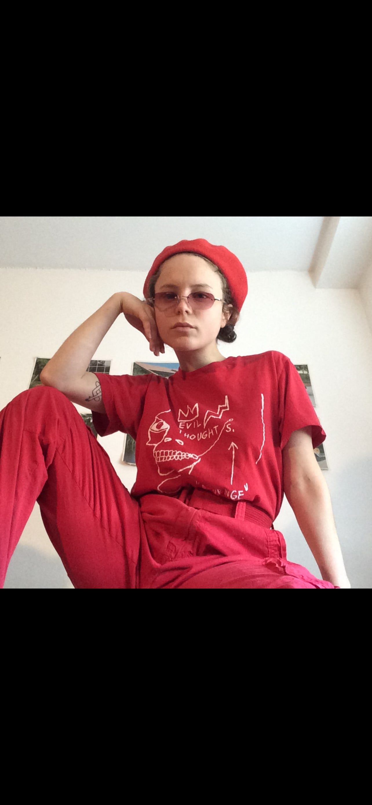 A favorite look that incorporated the ten-shot boots was to pair them with white overalls and a white top (or nothing underneath save for pasties over my already-saggy tits—some things never change). I also found a pair of red cargo pants with a built-in belt on the side of the road and frequently coupled them with fire-engine hued Basquiat tees, cutoff tanks, and, of course, my beloved red beret. I am thoughtfully leaving out the glamour shots I took in all red gripping my well-loved copy of The Communist Manifesto because nobody needs to see that.