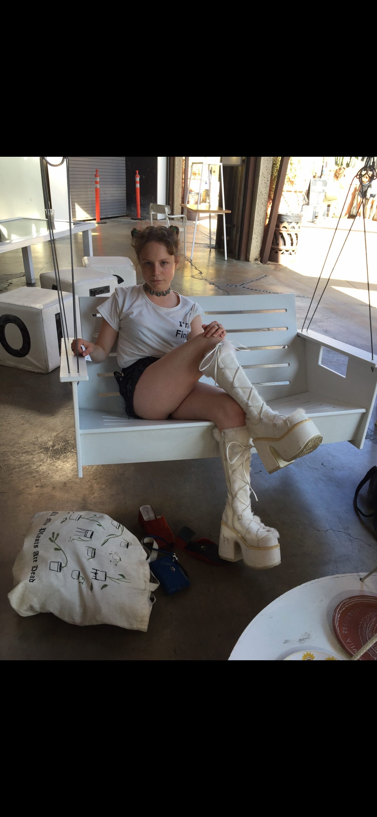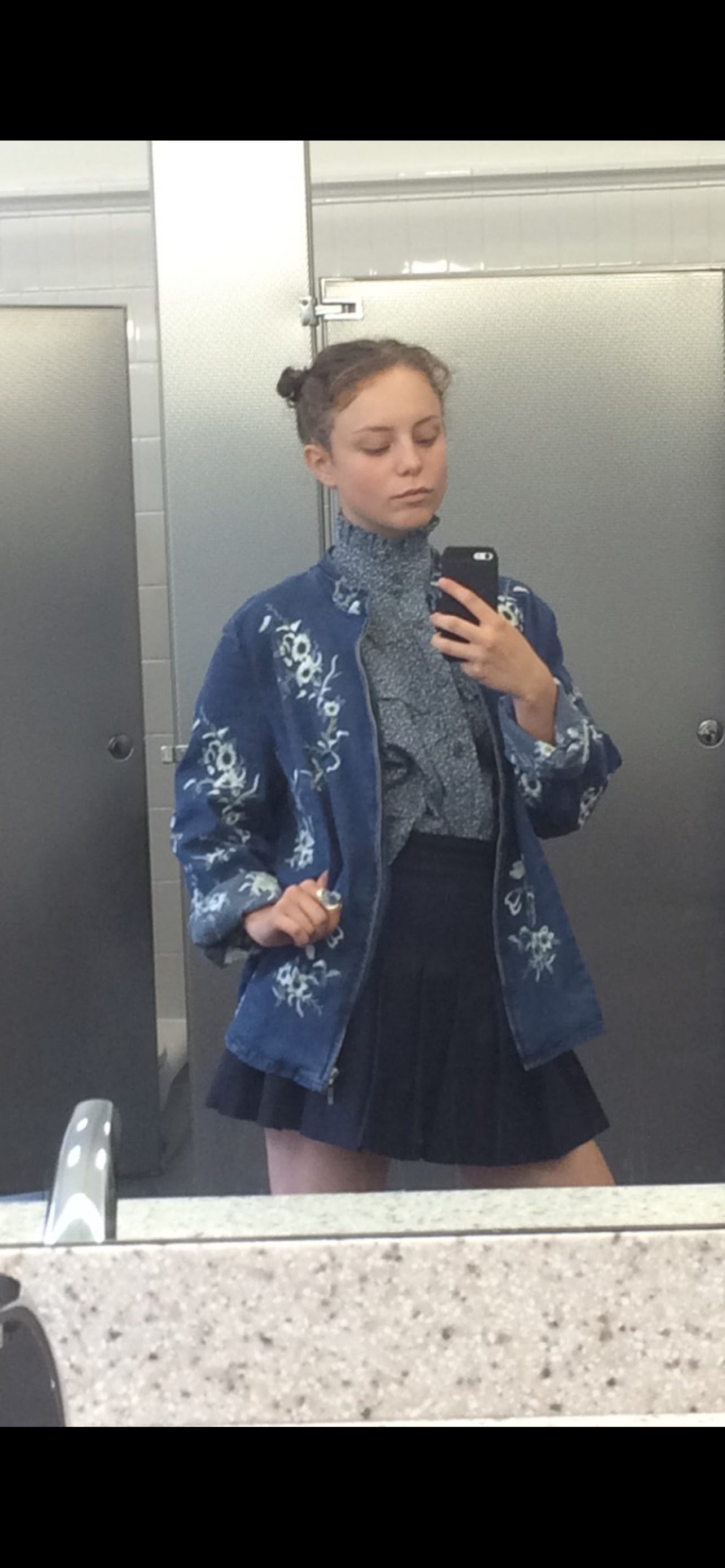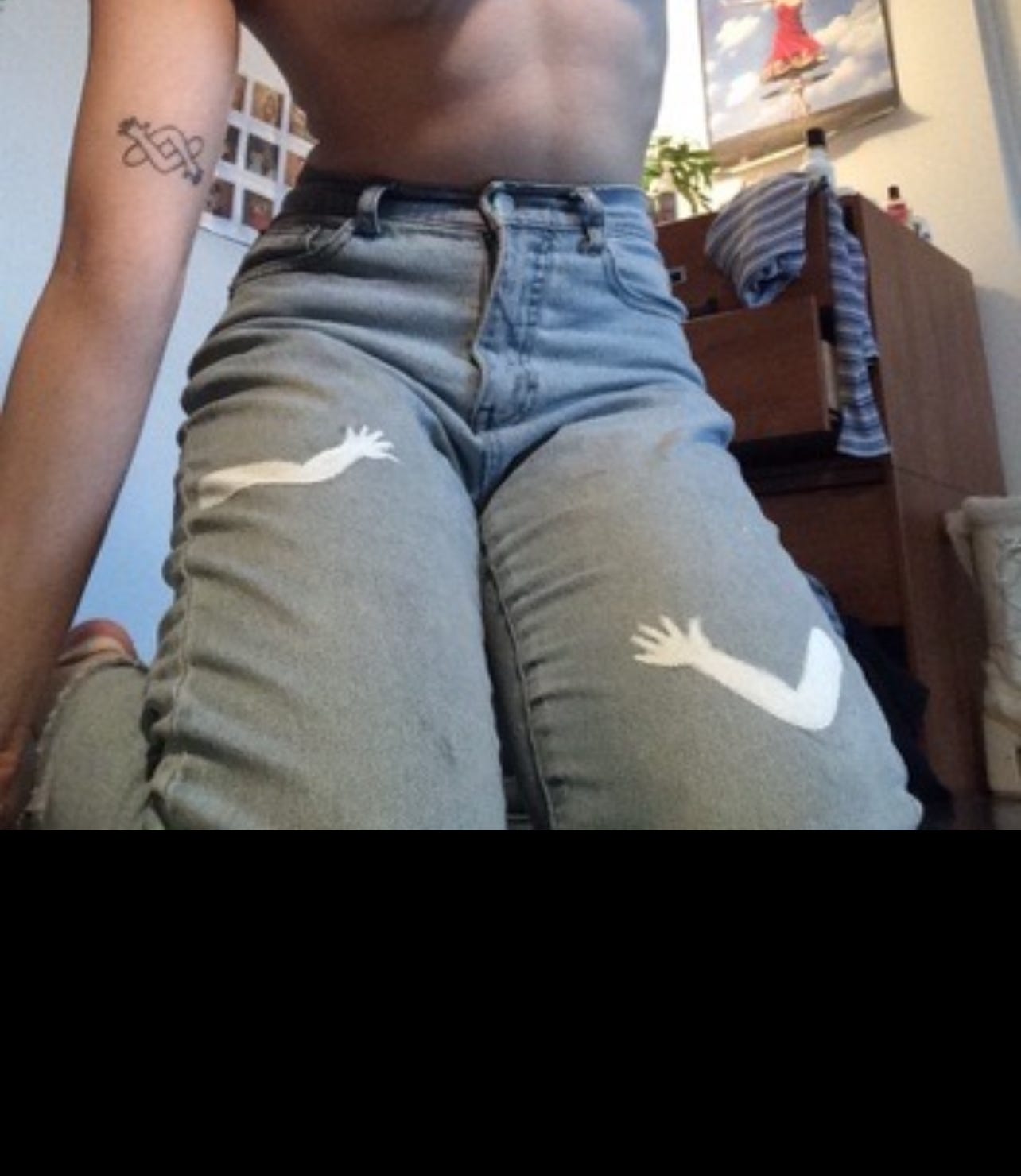 Ok, I only ever really managed to paint on one clothing item, the jeans below, which I adorned with a deconstruction of the arm logo (also as seen on MY arm in the below photo) from my to-this-day favorite film, Santa Sangre. Hey, this was before I got on ADHD meds and I couldn’t commit to a project to save my life. I’d like to pick up where I left off (lol, as if even my medicated brain could manage that). Someone who COULD is the very-cool Ca8ty whom I recently spotted on the streets of PDX in a hand-painted and -embroidered outfit I am still thinking about weeks later. Check her out for endless inspiration!