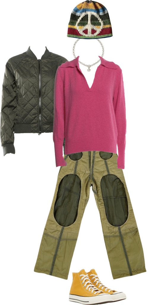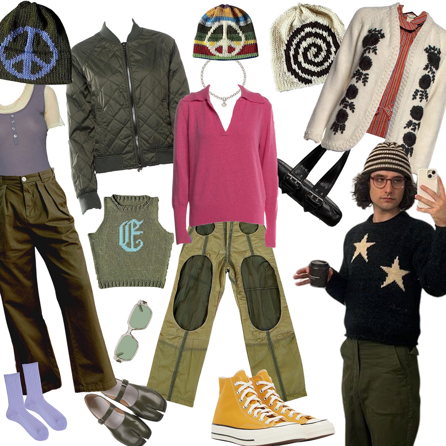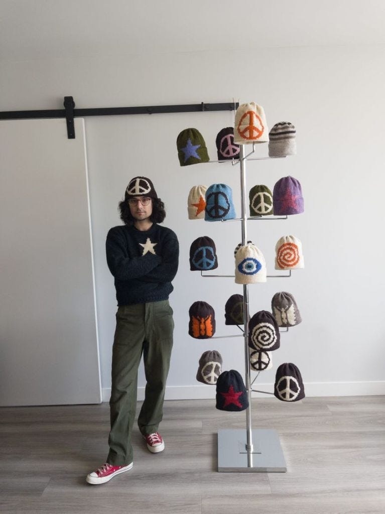 I appreciate our shared obsessive tendencies toward clothes even more when I see his self-produced knitwear in simple but perfected signature shapes, emblazoned with laid-back, expertly color-matched intarsia graphics, most commonly a chunky peace sign or star. His digital footprint consists mainly of three-by-three flatlays of his prolific beanies, the toes of one of his dozens of pairs of colorful Converse jutting in from the bottom of the photo, and selfies in which he models one of his also-popular cropped vests before delivering it to its eventual owner.