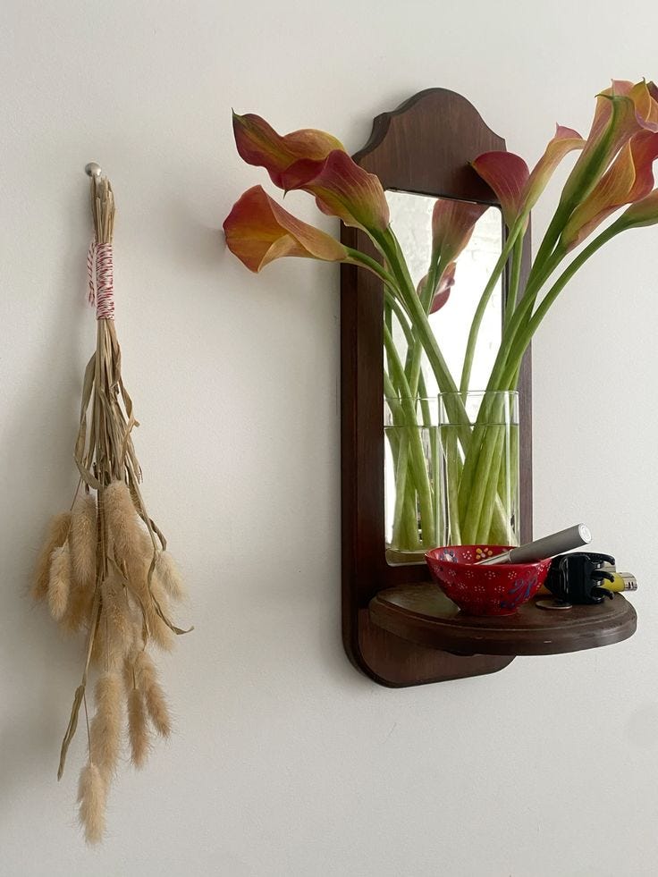 Anyway, back to interior decorating—man, this shit is hard. I haven’t had a room that has felt lovely to me since the beginning of Covid, and since then I’ve moved so many times I haven’t been able to build up the requisite stock of furniture, tchotchkes, and curiosities that make a room a palace. Also, I’m currently living in a glorified walk-in closet—no, seriously, I recently had to hang a curtain to hide the open-faced storage area that takes up an entire wall of my room, the wall my bed faces, so the one I’m staring at the entire time I occupy it. No matter how organized I keep it (which, usually, is not very), having to witness every single one of my possessions at all times got really claustrophobic-feeling and grating, but the Ikea curtains I chose (the only ones compatible with the railing installed by our building manager), though they match my desired color scheme. are wrinkly plastic and almost as depressing as the mess they hide.