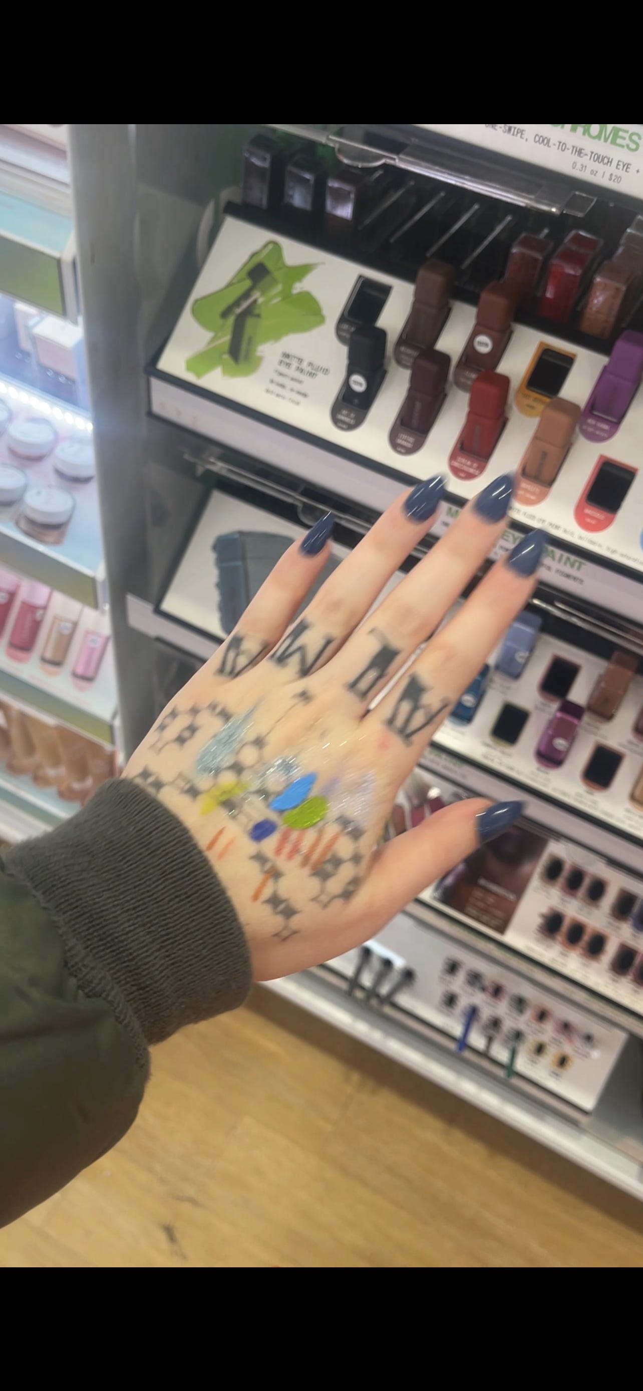 Apparently this is Halsey’s brand? Lol, well, she snapped! the two bigger smudges on my hand below are this eye paint, and let me tell you, it was like painting with acrylics. The most highly pigmented makeup I’ve ever seen. I love the Violet Beauregarde blues and Shrek green.