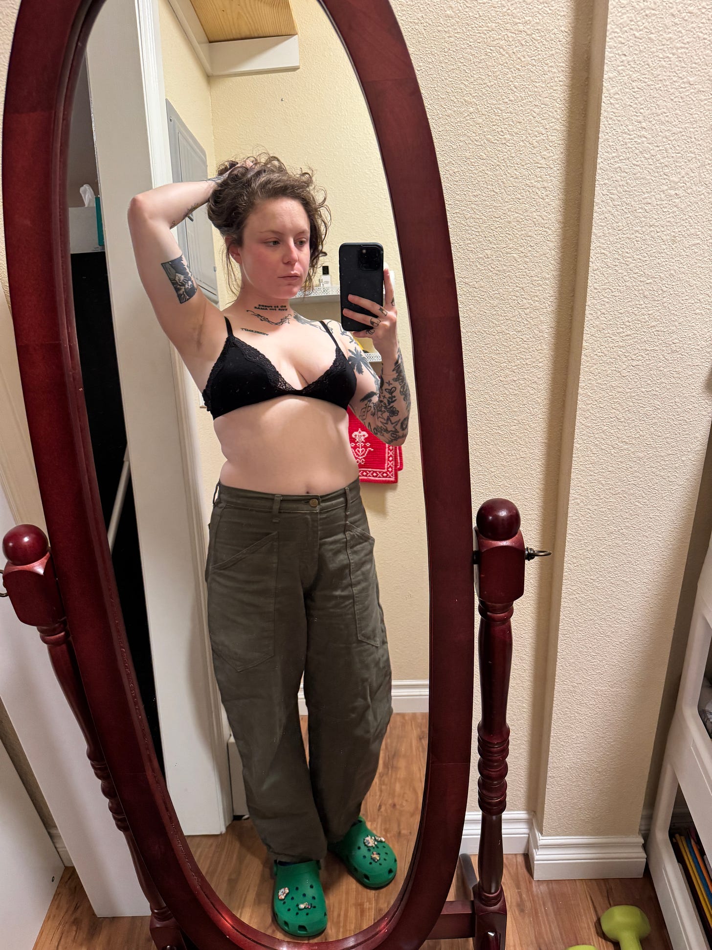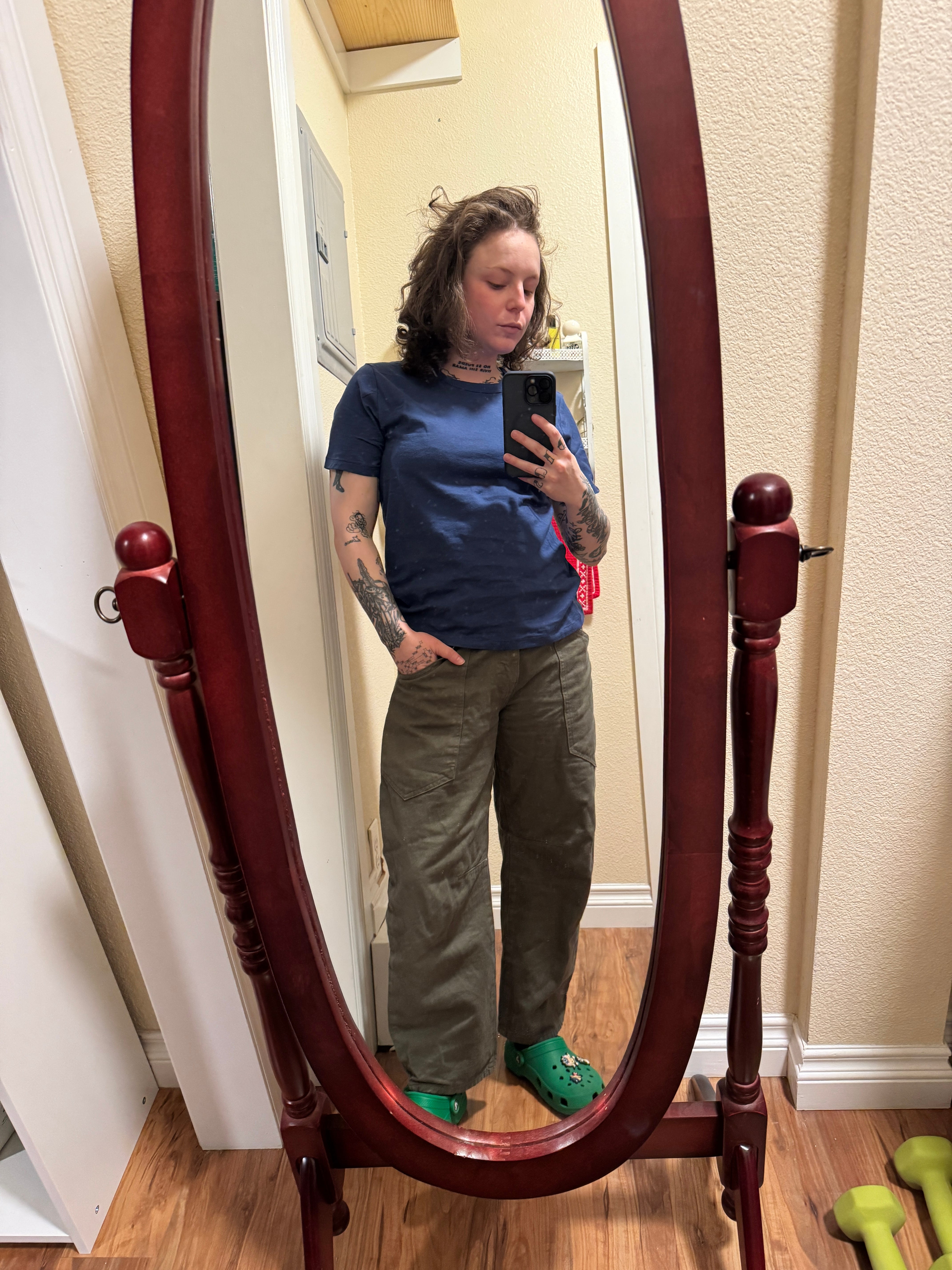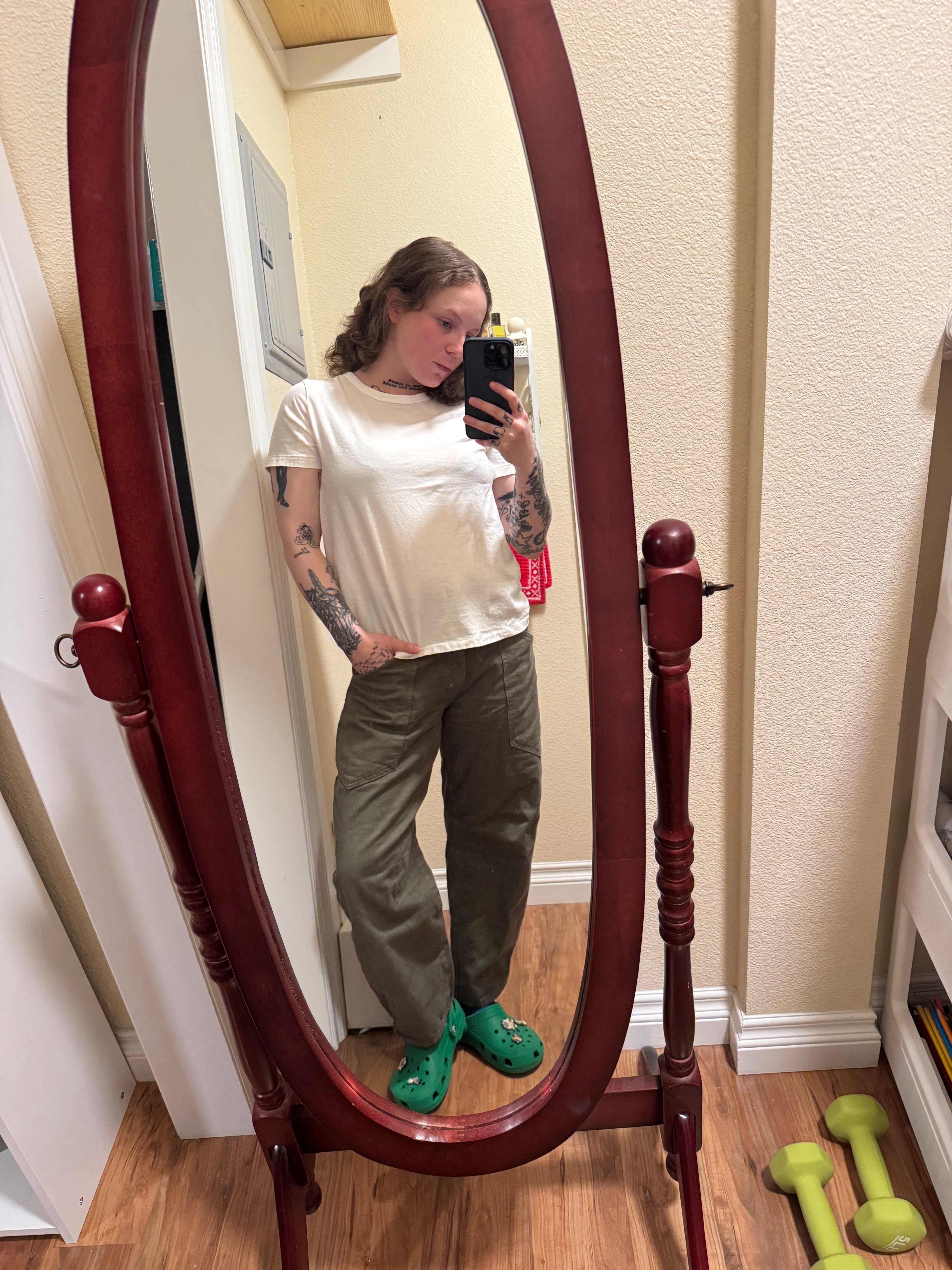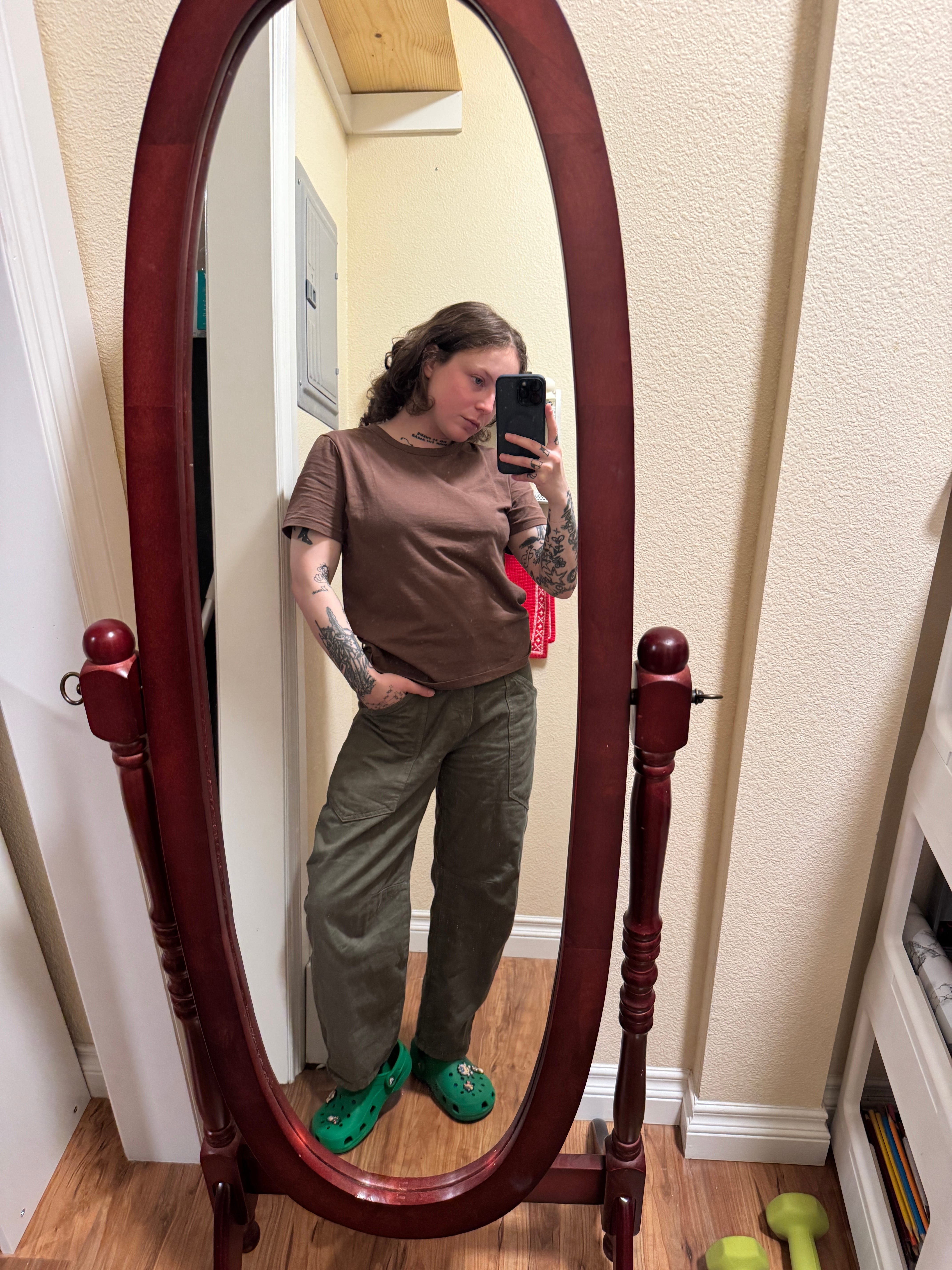These 100% cotton T-shirts are golden. Opaque enough to not wear a bra with no fear but sheer enough to show a colorful bra in service of the aforementioned slutdom and cut at the exact right point on the hips, the only thing I’d warn about these tees is that they run small, especially in the shoulder area. This is me in a Small, and it’s almost too small for my liking.