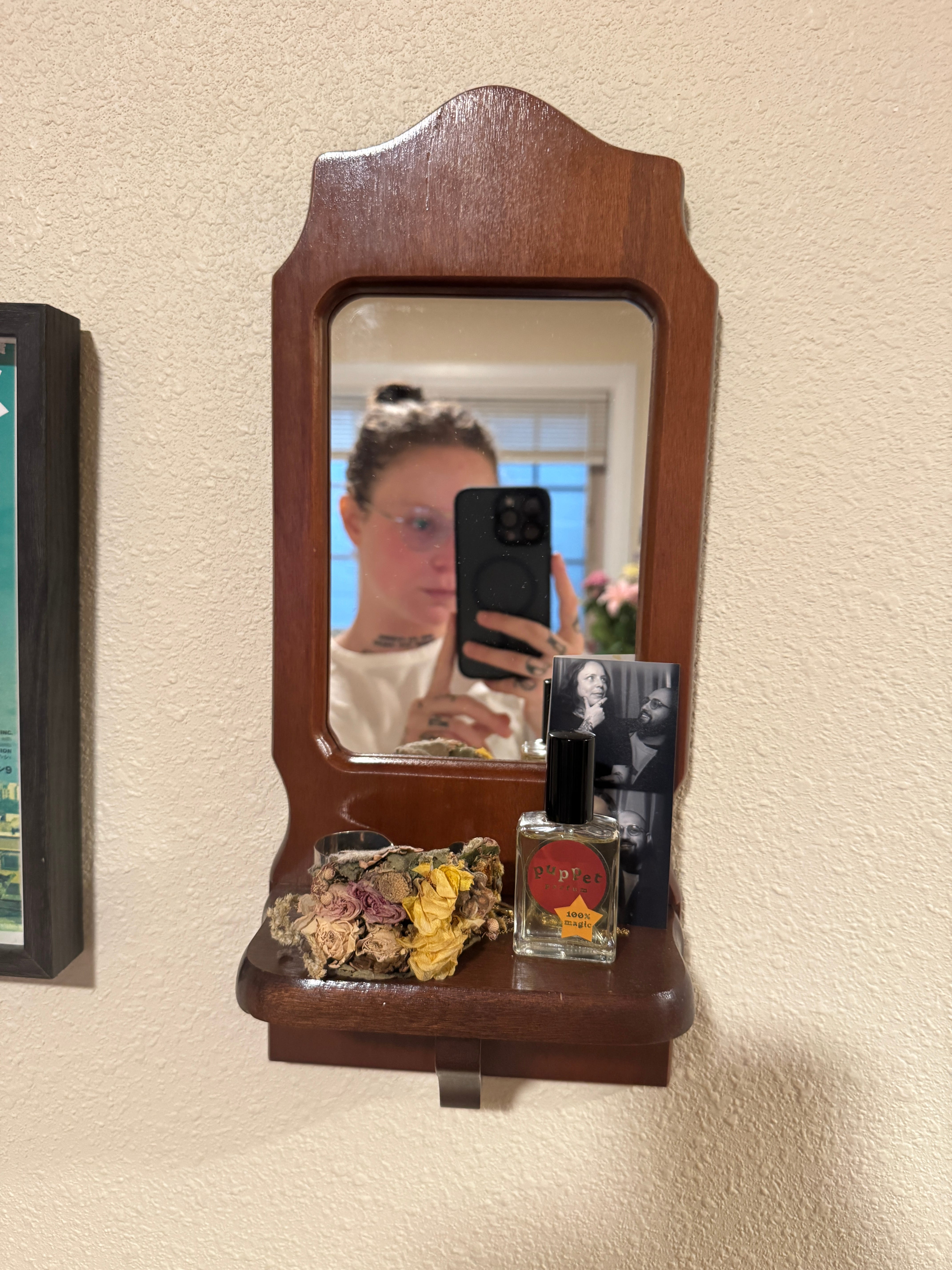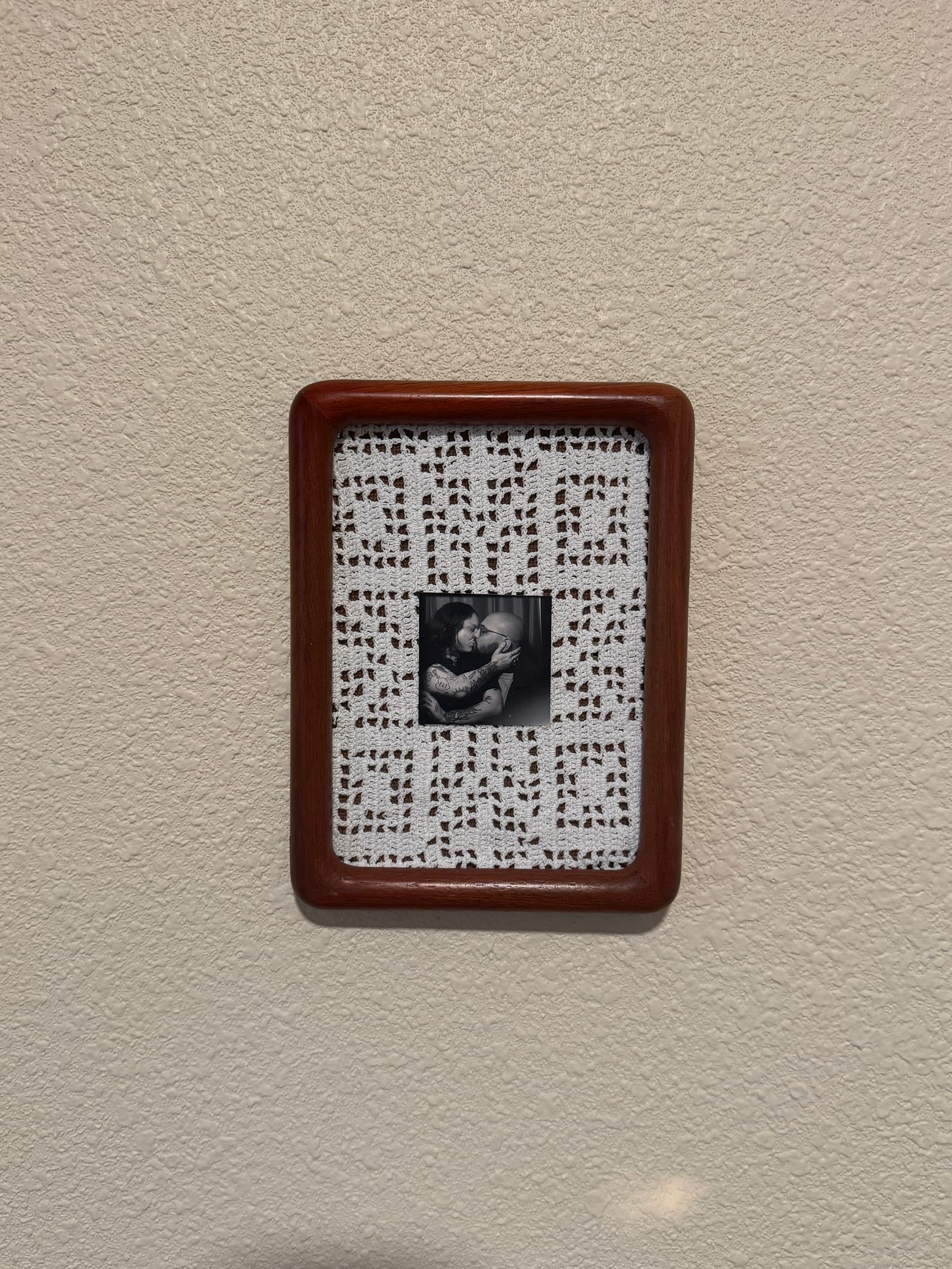 Inspired by this image, I decided to create a little photo booth pic tableau with my favorite snap of myself and my guy. It was SHOCKINGLY hard to find an appropriate lace doily, but Memory Den has them aplenty if you’re in PDX (literally nowhere else I searched had them!). My biggest snafu was that the frame itself didn’t have enough room to accommodate a thick layer of fabric in between the backing and the glass, so I ended up having to go glassless and glue the lace on from the front, cutting and tucking it under the frame until it looked decent, hence the reason the image is slightly off-center, but I think that just adds to its charm. This has enthused me into the desire to complete 10000 more simple DIYs for my new place, most notably: