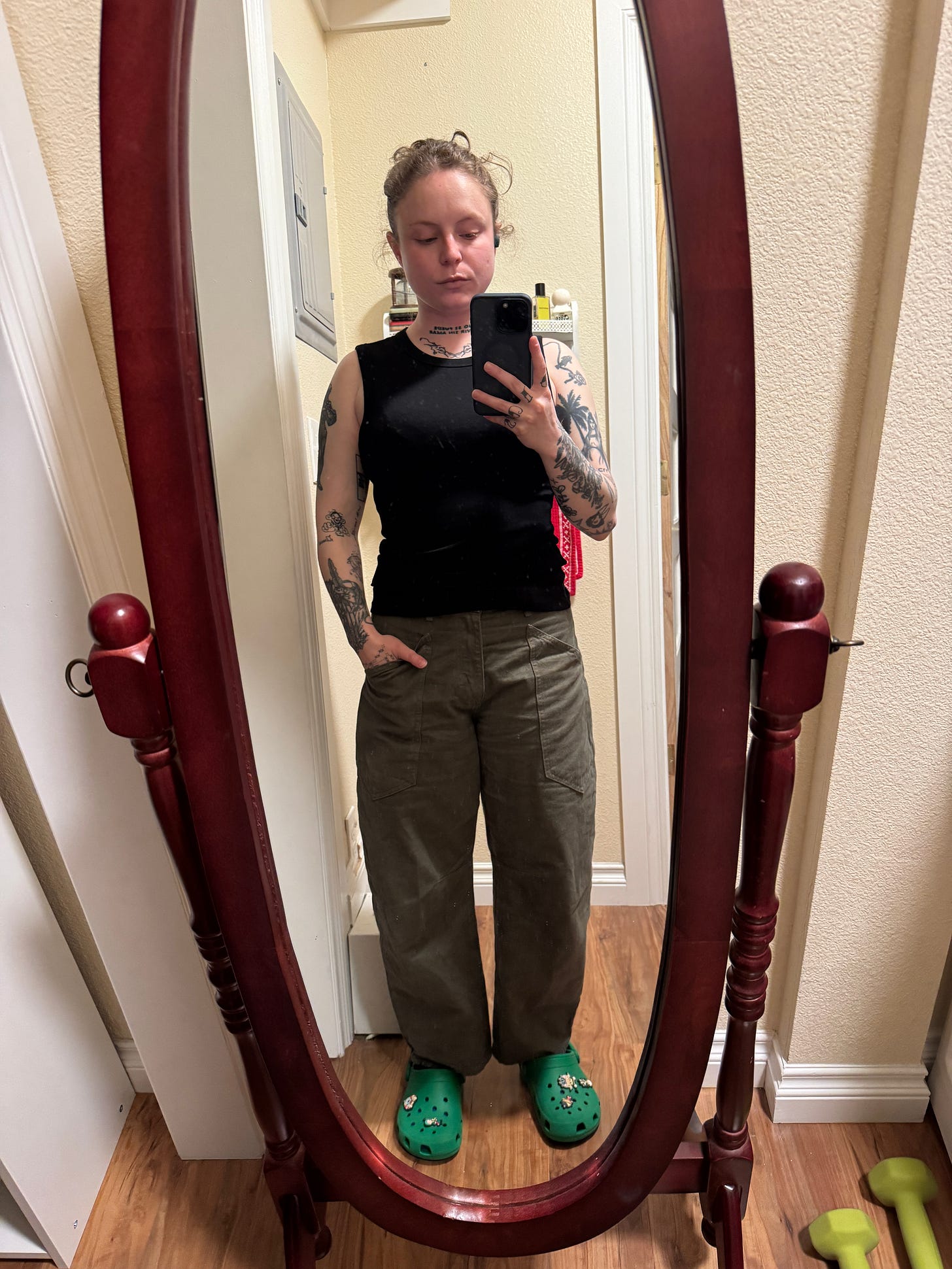 This tank is fantastic—the perfect slinky to solid ratio, cut in mostly cotton. However, it runs a bit long in the torso in a way I didn’t quite expect, given that the models on the website all have it scrunched up the wazoo—nice for a full-coverage situation but less adhering to my summer 2026 agenda of constant slutdom.
