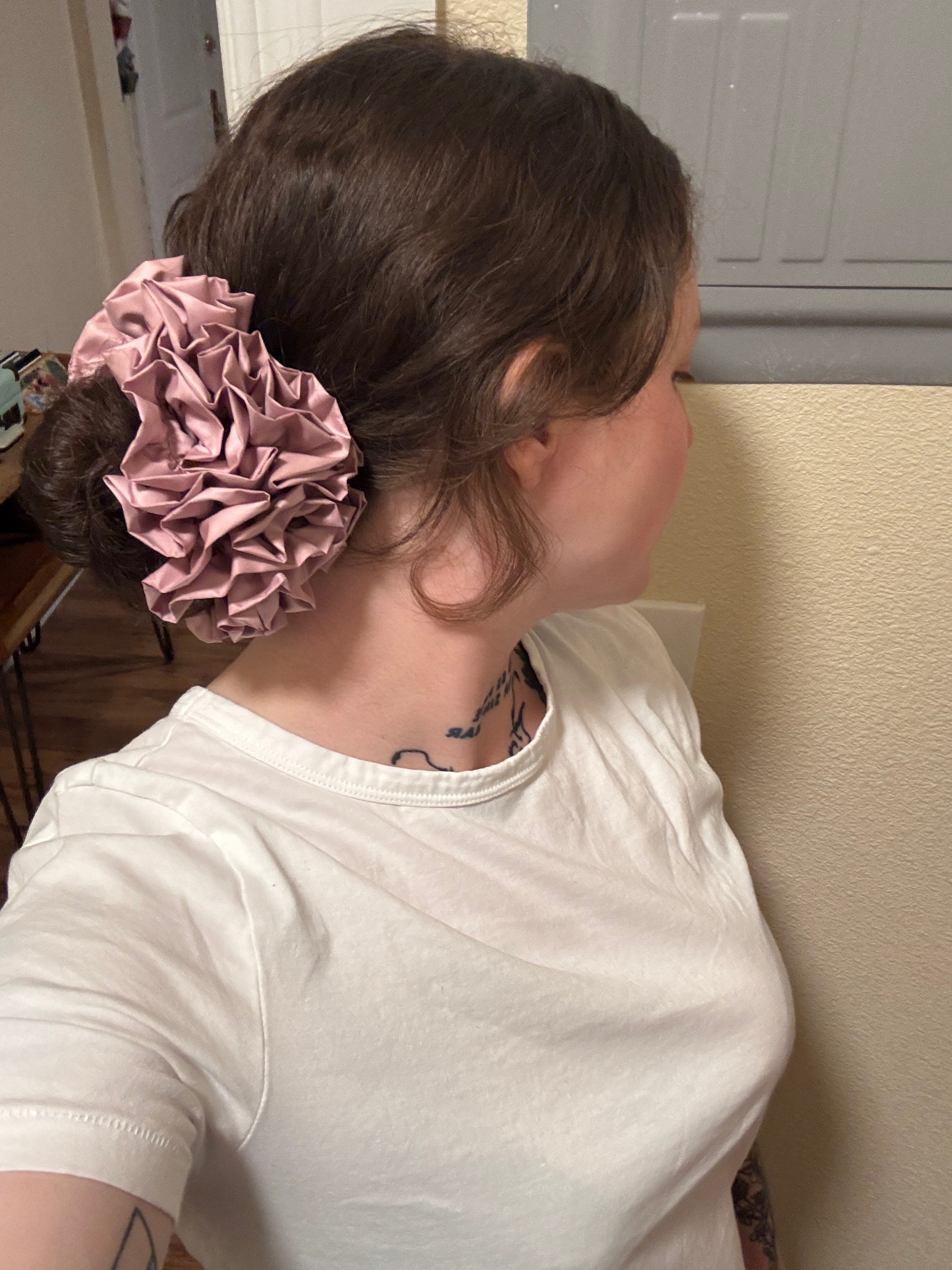 Good Squish had a clearance sale, and let me make it quite clear to you: DO NOT BUY THEIR SCRUNCHIES FULL-PRICE. The piece, rendered in Japanese nylon, is absolutely gorgeous and features a neon green bungee toggle (not pictured) that allows for tightening and loosening since you obviously can’t loop this scrunchie around your hair more than once. I think it’s quite a fetching hair accessory, much bigger than I imagined but subdued enough in its rugged materials and dusty pink shade that I can wear it whenever I damn well please. HOWEVER, these are still not worth $70 with shipping. $30 is still extremely steep but if you think of it like a piece of jewelry or a hat, both of which it kind of is, it becomes more understandable.