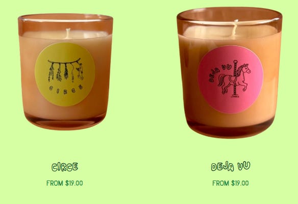I wrote about these the other week, and both my sister and I ended up loving them—these are the two scents I got and they’re both exquisite. Circe is an oily, salty, fermented bready delight and Deja Vu is a mellow but romantically saccharine middle school makeup concoction. Both I warm using my candle warmer instead of burning and I think they’ll last for, at minimum, a year each (and I got the small ones).