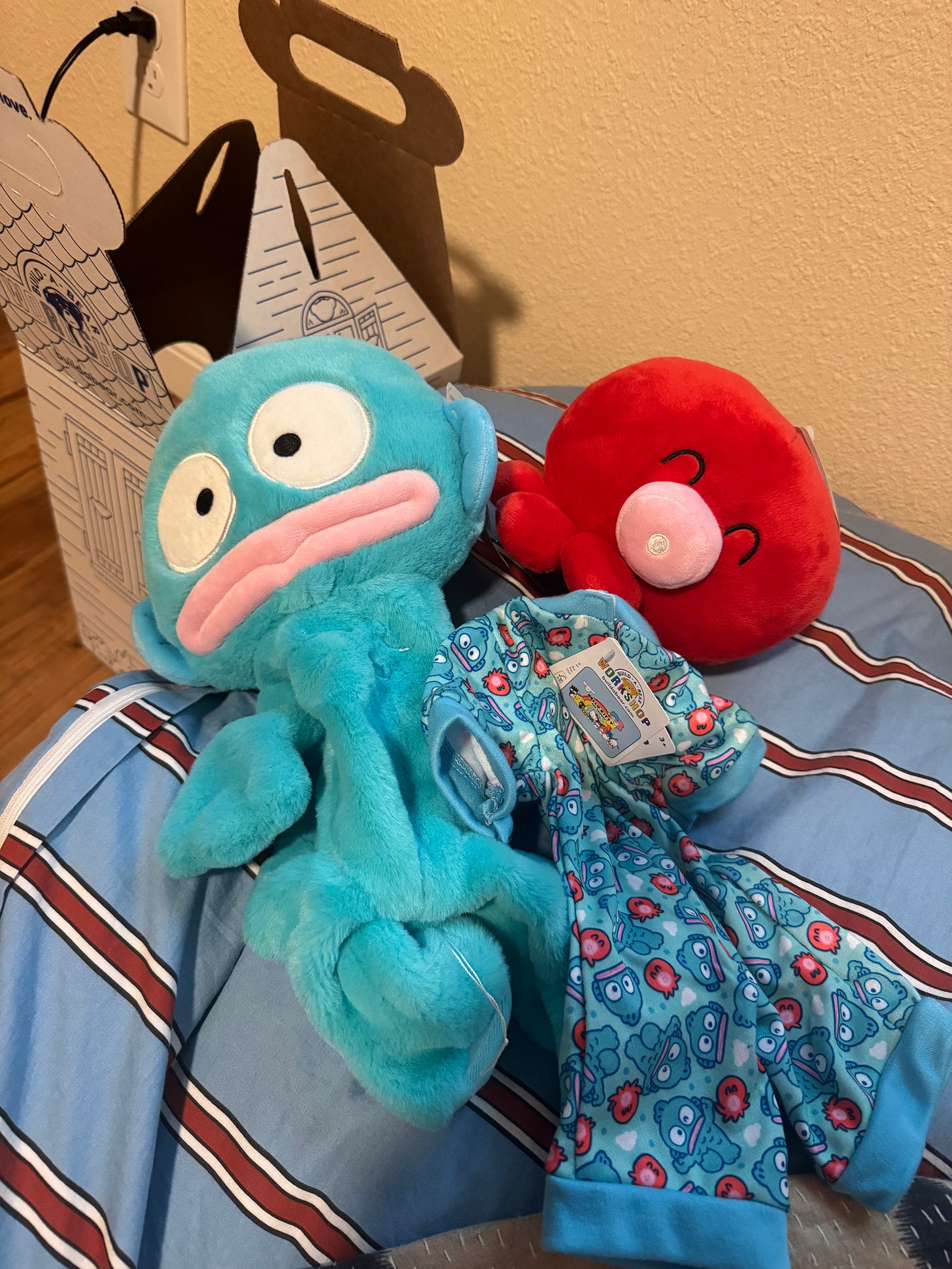 For my birthday at the beginning of the month, I ordered myself this guy. Hangyodon. He only just arrived, and I’d gotten him unstuffed because a month ago I naively believed that my life would allow for a prompt trip to Build-A-Bear to get him filled according to my firmness specifications. It is not so, but I simply can’t wait until he is fully realized and decked out, first in his cutie pajamas (pictured) and then in the pair of overalls I can’t stop obsessively imagining him in. Hangyodon is my favorite Sanrio character, and though it took me a second to get over how they anthropomorphized him more than I bargained for in this Build-A-Bear, I am now completely devoted to this doll, its dazzlingly soft pelt, and its octopus friend Sayuri.