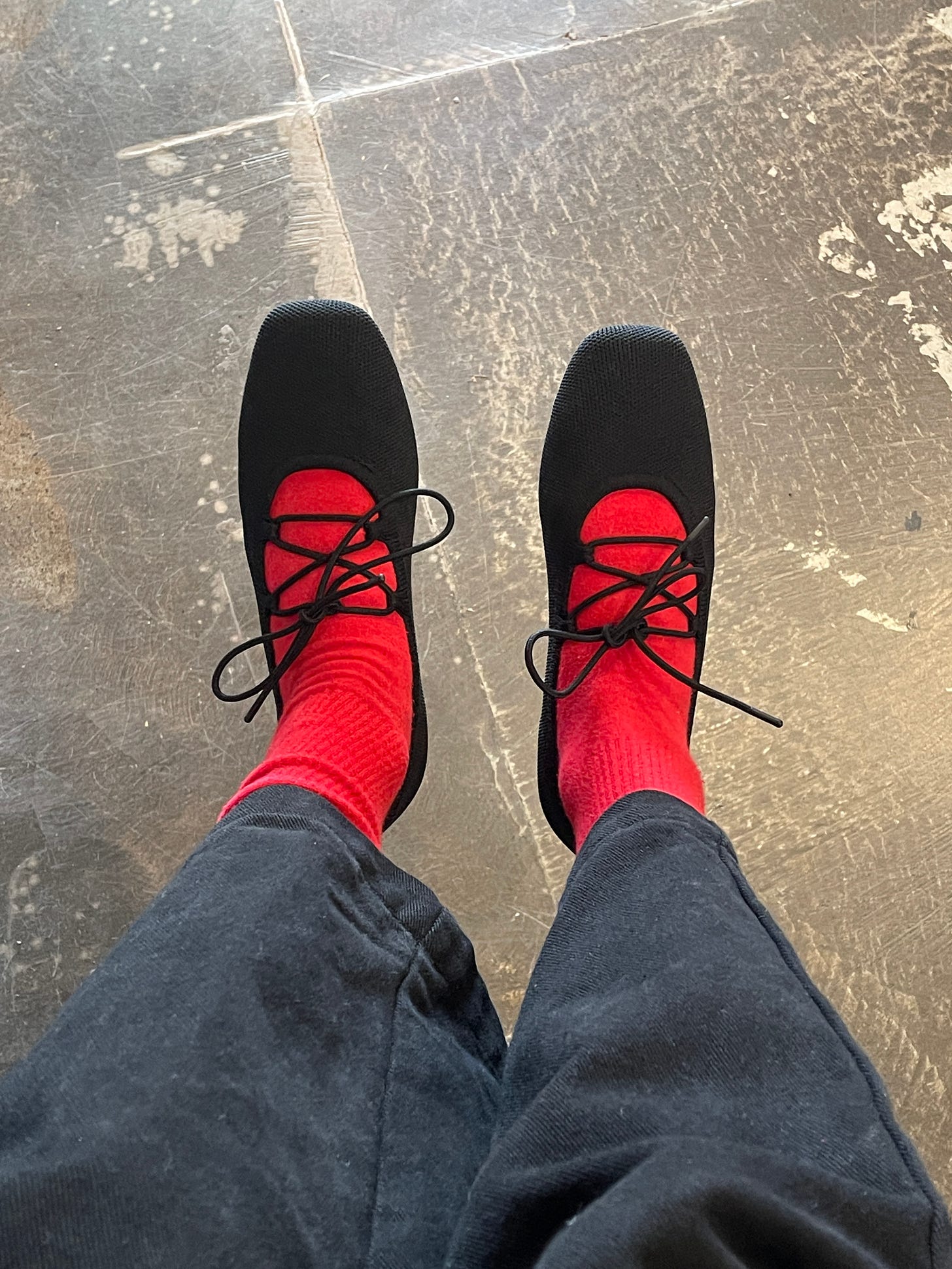recommended these to me when I was looking for non-ugly shoes I could still conceivably wear to work, and I have since done so and can confirm that even for someone with glass bones and paper skin like myself, they are viable choices for an eight-hour workday, though I will say that the laces above come untied at the drop of a hat. However, the shoes come with two other pairs of cute laces that are much less prone to untying themselves in gingham and polka-dot, and I’m excited to try them both. Here they are in sunnier times:And here’s my genius copywrited idea to get satiny black ribbon and string a red pom-pom on each for a Pierrot-core twist:
